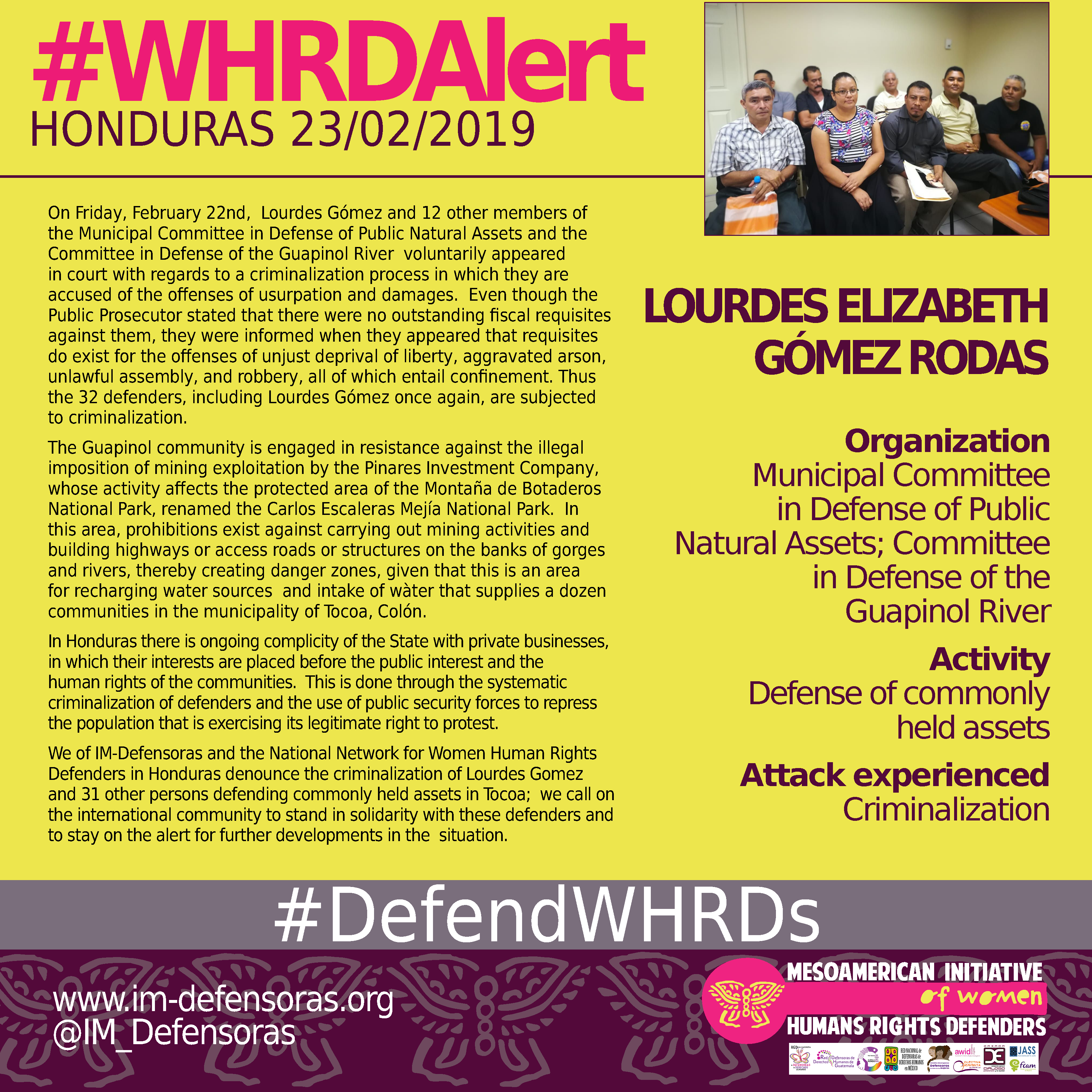 We of IM-Defensoras and the National Network for Women Human Rights Defenders in Honduras denounce the criminalization of Lourdes Gomez and 31 other persons defending commonly held assets in Tocoa; we call on the international community to stand in solidarity with these defenders and to stay on the alert for further developments in the situation.