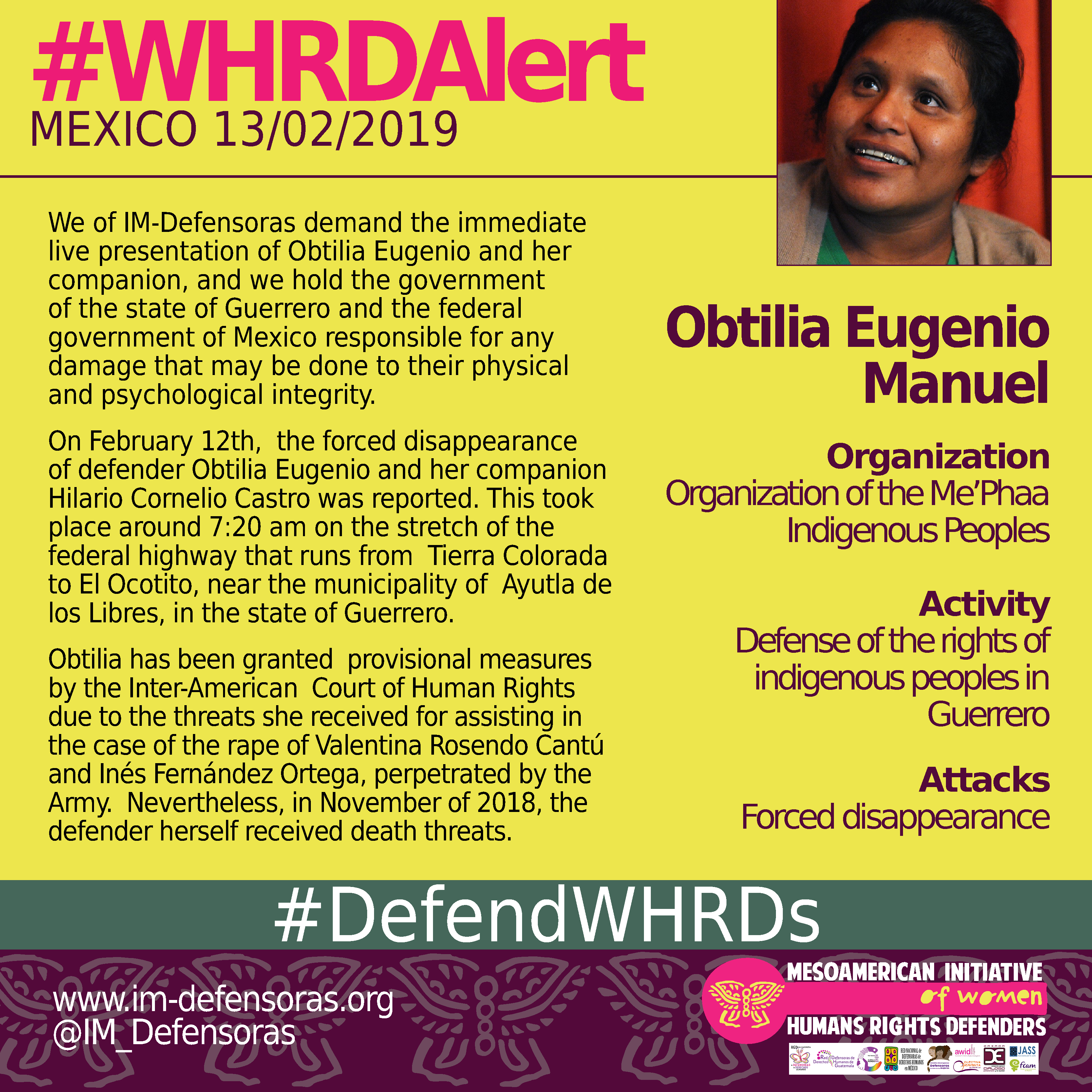 THE FACTS – We of IM-Defensoras demand the immediate live presentation of Obtilia Eugenio and her companion, and we hold the government of the state of Guerrero and the federal government of Mexico responsible for any damage that may be done to their physical and psychological integrity.