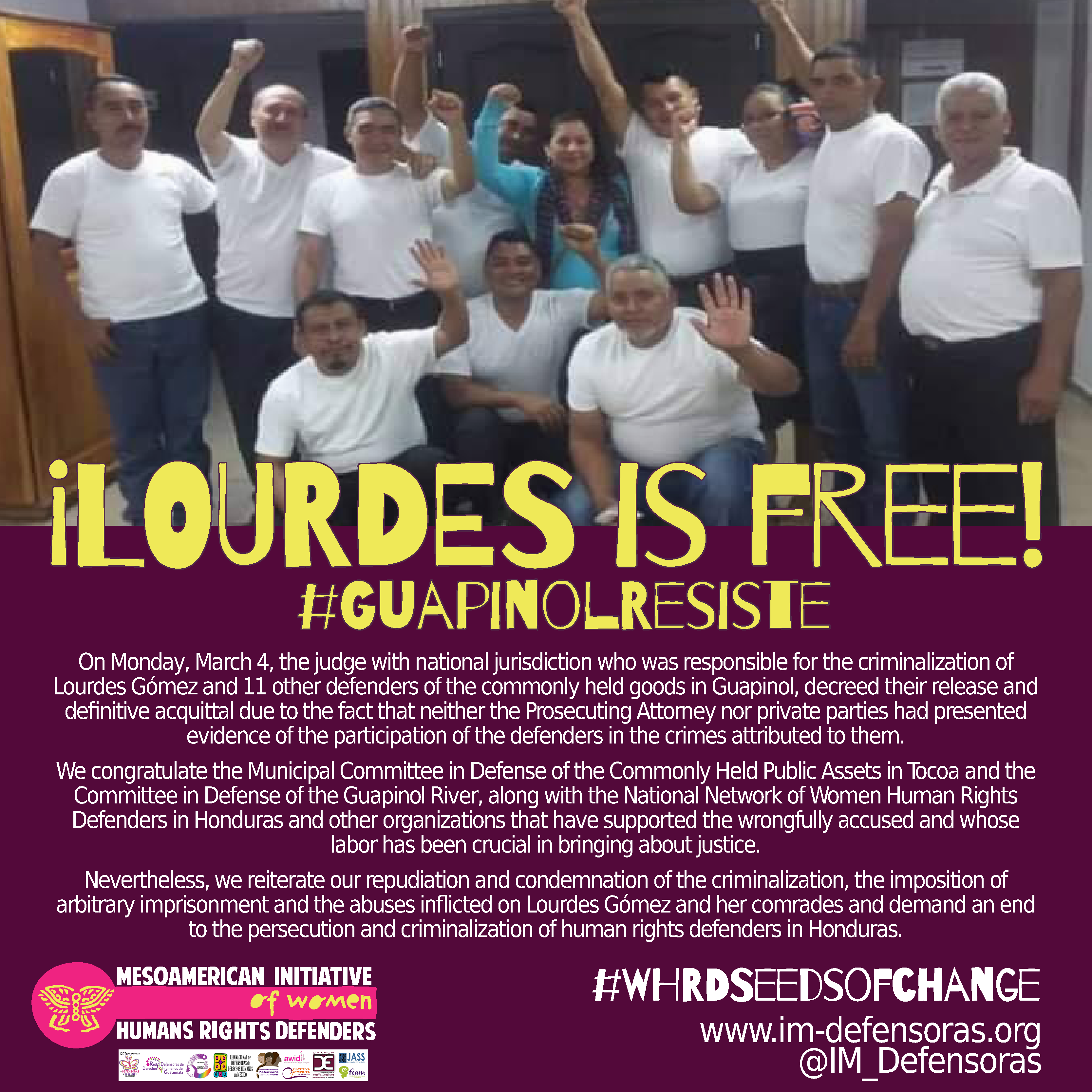 Nevertheless, we reiterate our repudiation and condemnation of the criminalization, the imposition of arbitrary imprisonment and the abuses inflicted on Lourdes Gómez and her comrades and demand an end to the persecution and criminalization of human rights defenders in Honduras.