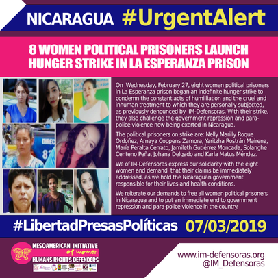 On Wednesday, February 27, eight women political prisoners in La Esperanza prison began an indefinite hunger strike to condemn the constant acts of humilliation and the cruel and inhuman treatment to which they are personally subjected, as previously denounced by IM-Defensoras. With their strike, they also challenge the government repression and para-police violence now being exerted in Nicaragua.