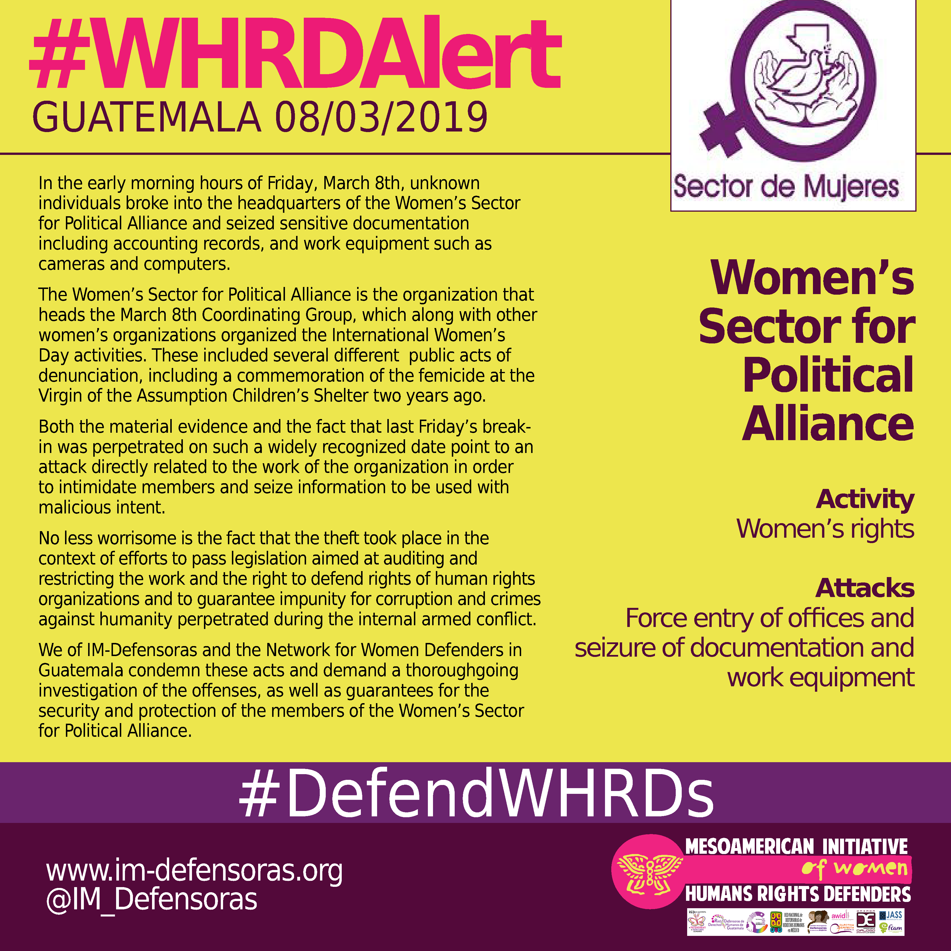 We of IM-Defensoras and the Network for Women Defenders in Guatemala condemn these acts and demand a thoroughgoing investigation of the offenses, as well as guarantees for the security and protection of the members of the Women’s Sector for Political Alliance.