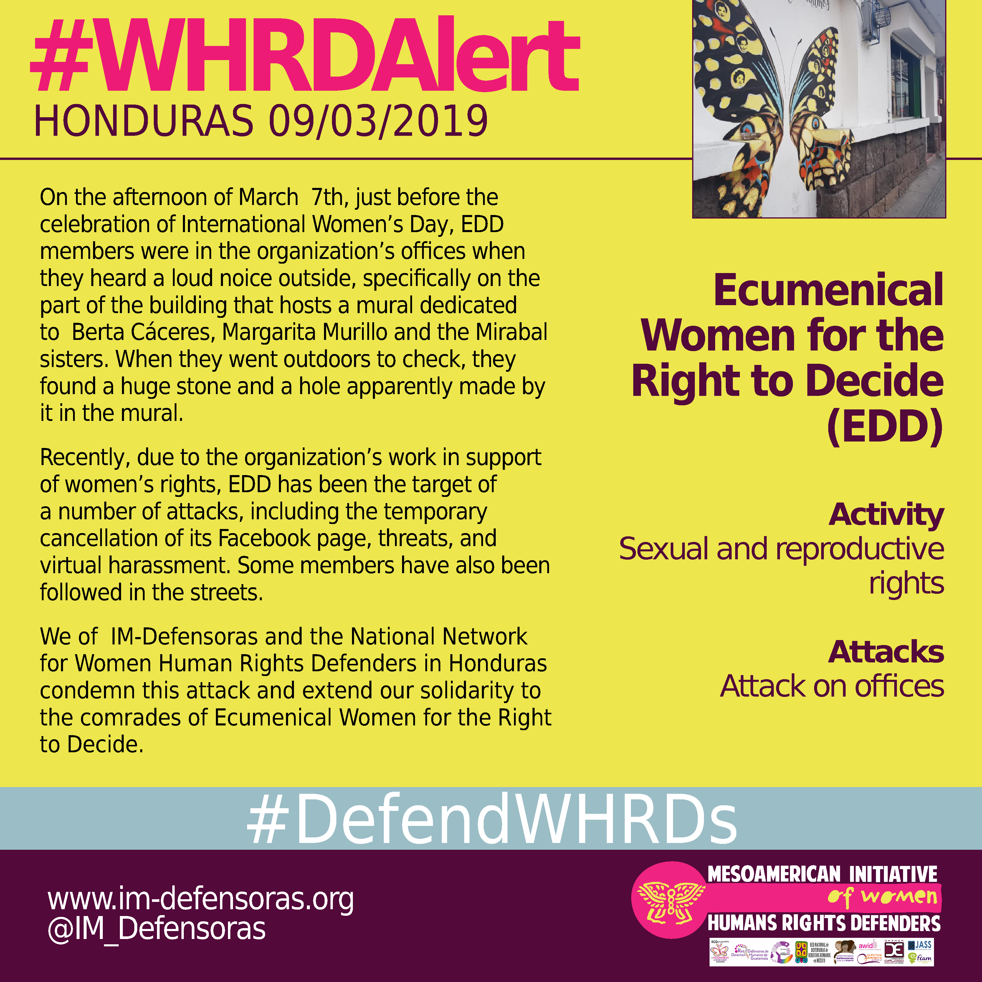 We of IM-Defensoras and the National Network for Women Human Rights Defenders in Honduras condemn this attack and extend our solidarity to the comrades of Ecumenical Women for the Right to Decide.