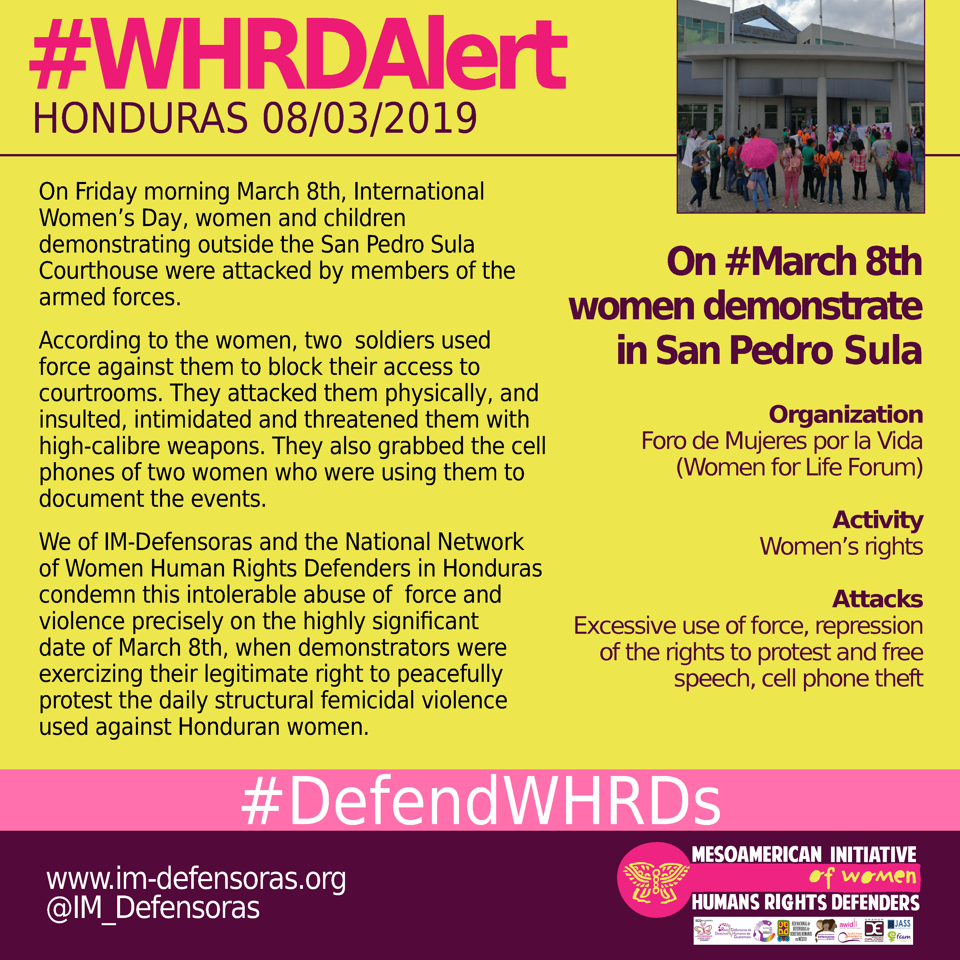 We of IM-Defensoras and the National Network of Women Human Rights Defenders in Honduras condemn this intolerable abuse of force and violence precisely on the highly significant date of March 8th, when demonstrators were exercizing their legitimate right to peacefully protest the daily structural femicidal violence used against Honduran women.