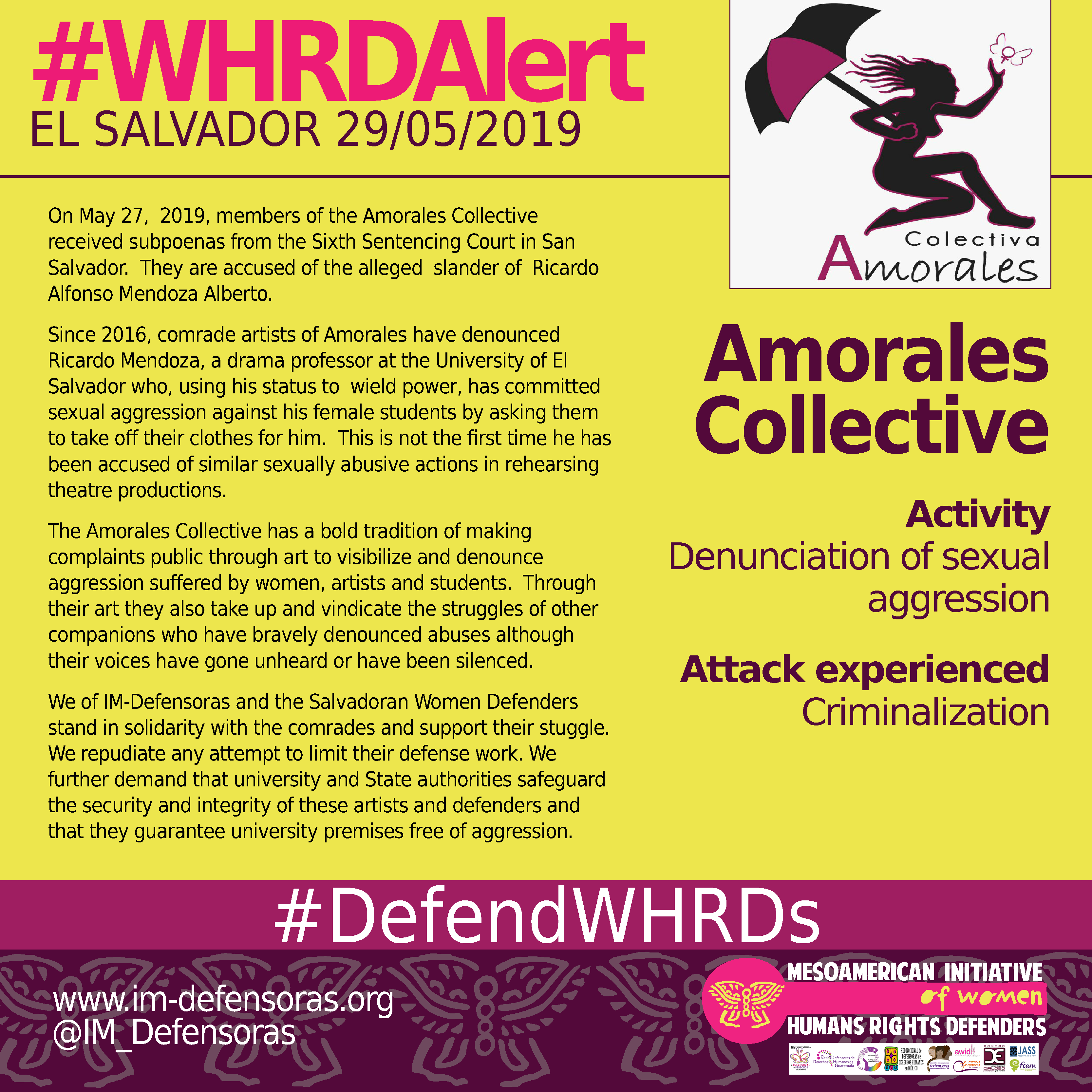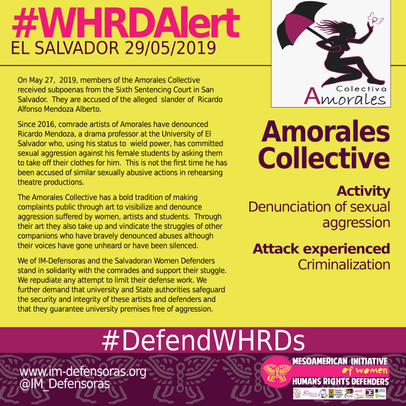 We of IM-Defensoras and the Salvadoran Women Defenders stand in solidarity with the comrades and support their stuggle. We repudiate any attempt to limit their defense work. We further demand that university and State authorities safeguard the security and integrity of these artists and defenders and that they guarantee university premises free of aggression.