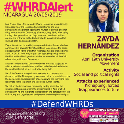 THE FACTS – Last Friday, May 17th, defender Zayda Hernández was arbitrarily kidnapped near the Managua Cathederal while she was participating in a protest against the murder of political prisoner Eddy Montes Praslin. On Sunday afternoon, May 19th, after being forcibly disappeared for two days, unknown assailants left her outside the entrance to the Cathedral with signs indicating that she had been tied up and beaten.