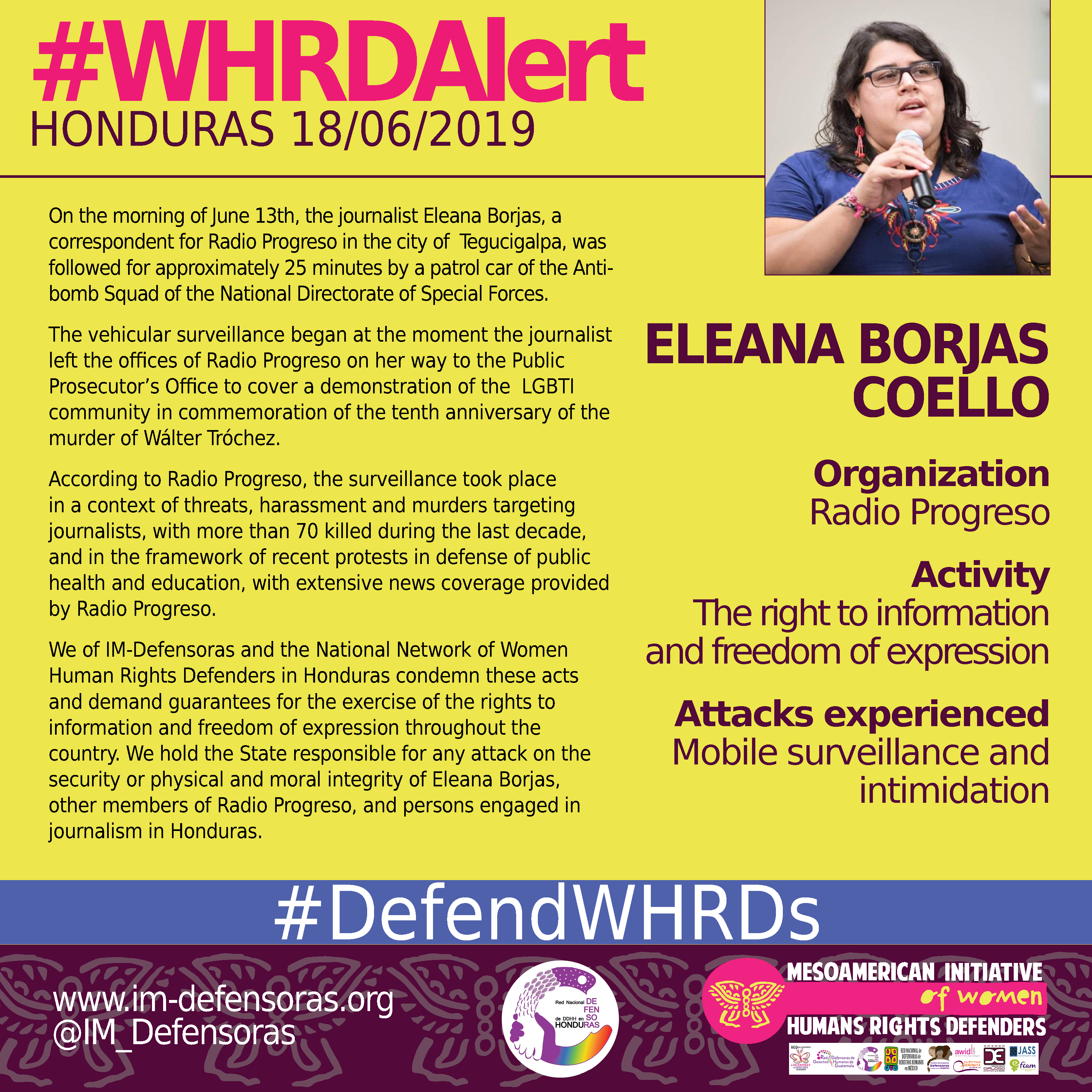 We of IM-Defensoras and the National Network of Women Human Rights Defenders in Honduras condemn these acts and demand guarantees for the exercise of the rights to information and freedom of expression throughout the country. We hold the State responsible for any attack on the security or physical and moral integrity of Eleana Borjas, other members of Radio Progreso, and persons engaged in journalism in Honduras.