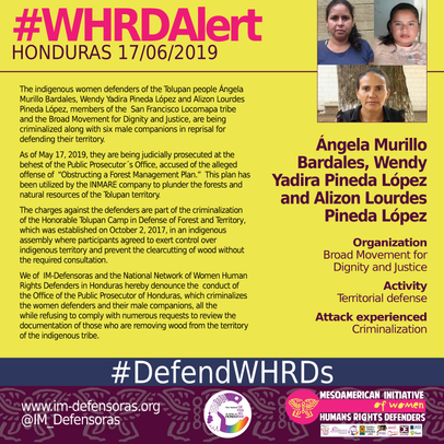 THE FACTS – The indigenous women defenders of the Tolupan people Ángela Murillo Bardales, Wendy Yadira Pineda López and Alizon Lourdes Pineda López, members of the San Francisco Locomapa tribe and the Broad Movement for Dignity and Justice, are being criminalized along with six male companions in reprisal for defending their territory.