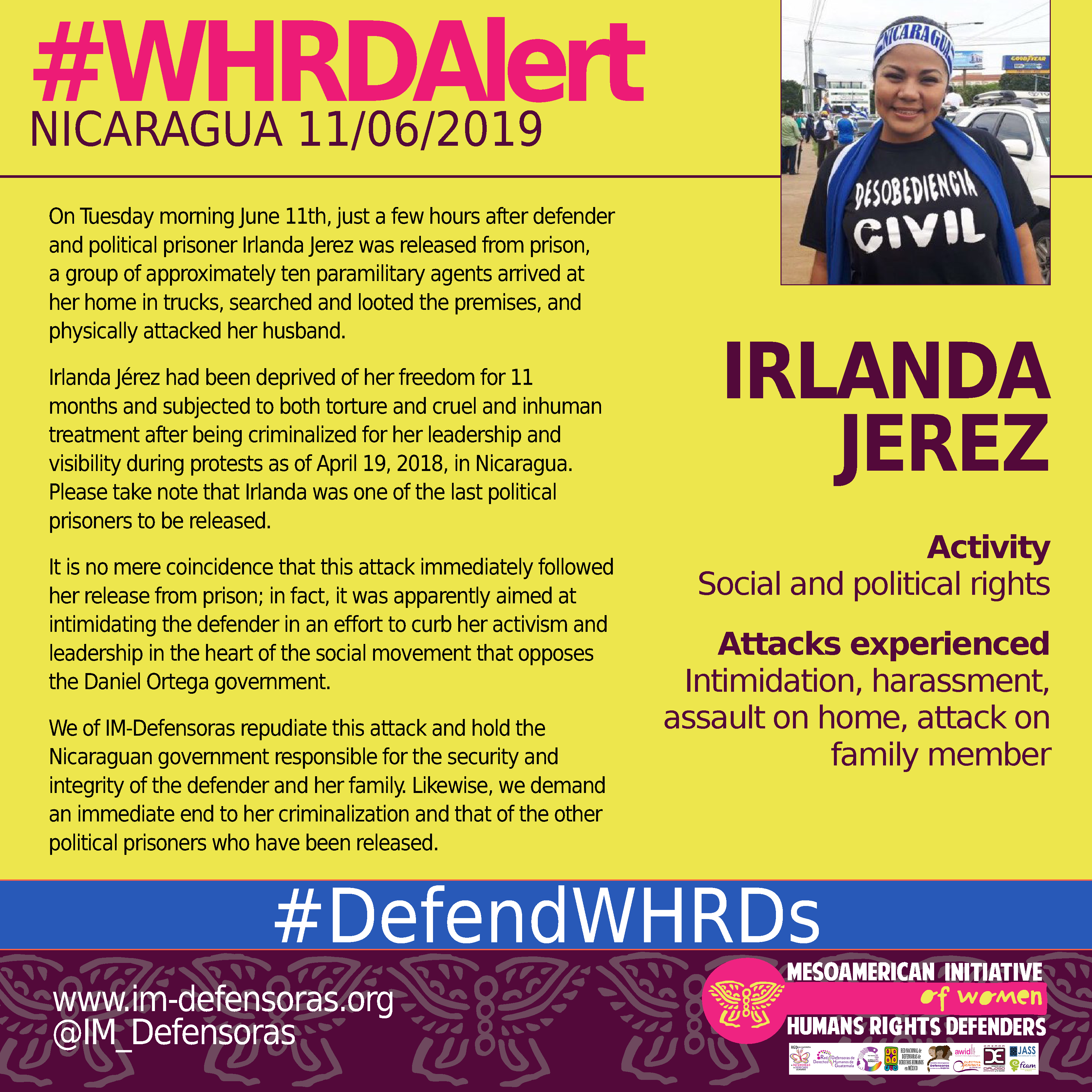 We of IM-Defensoras repudiate this attack and hold the Nicaraguan government responsible for the security and integrity of the defender and her family. Likewise, we demand an immediate end to her criminalization and that of the other political prisoners who have been released.