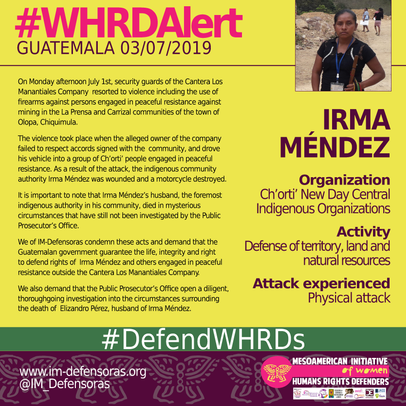 We of IM-Defensoras condemn these acts and demand that the Guatemalan government guarantee the life, integrity and right to defend rights of Irma Méndez and others engaged in peaceful resistance outside the Cantera Los Manantiales Company.