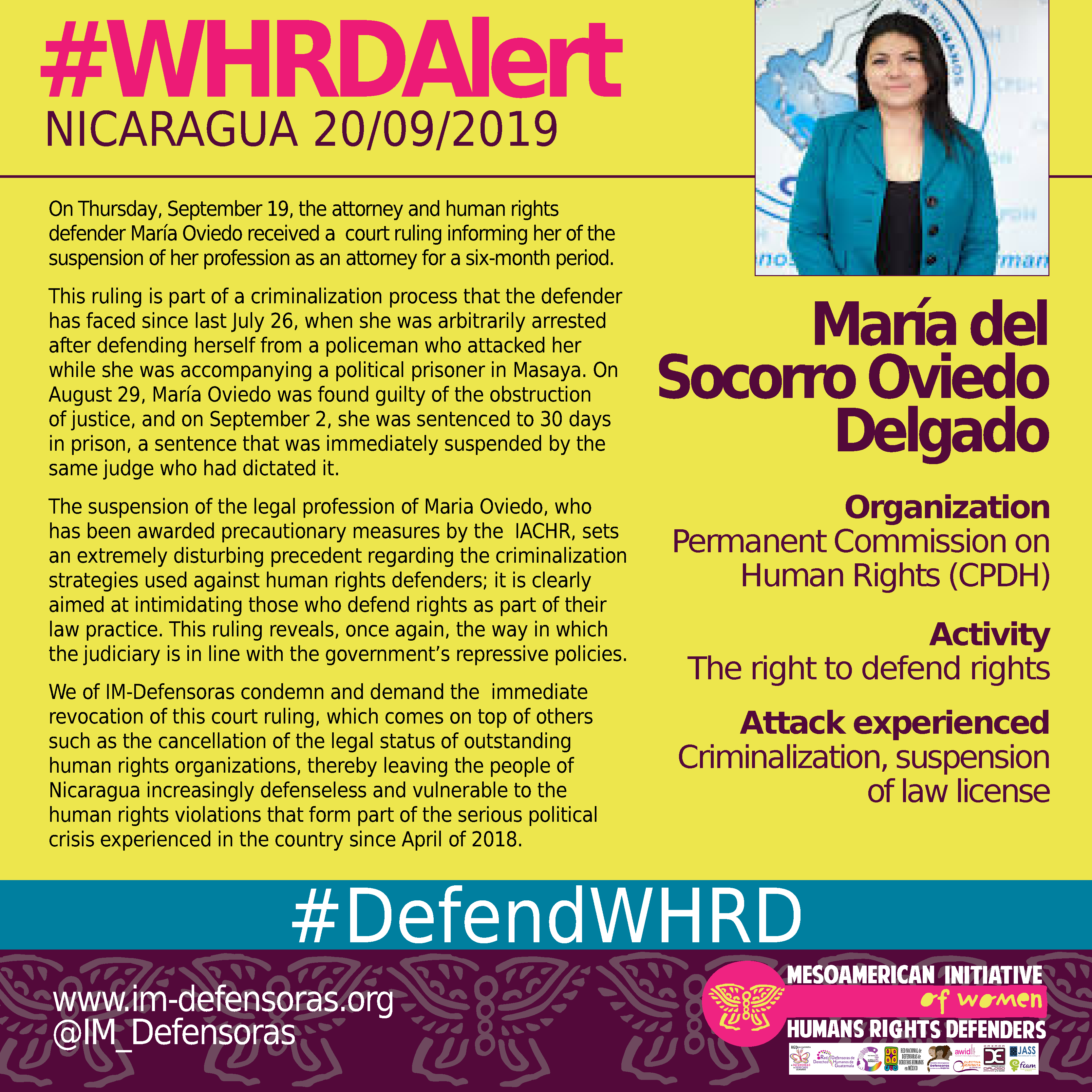 We of IM-Defensoras condemn and demand the immediate revocation of this court ruling, which comes on top of others such as the cancellation of the legal status of outstanding human rights organizations, thereby leaving the people of Nicaragua increasingly defenseless and vulnerable to the human rights violations that form part of the serious political crisis experienced in the country since April of 2018.