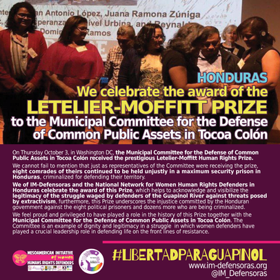 HONDURAS / We celebrate the award of the LETELIER-MOFFITT PRIZE to the Municipal Committee for the Defense of Common Public Assets in Tocoa Colón.