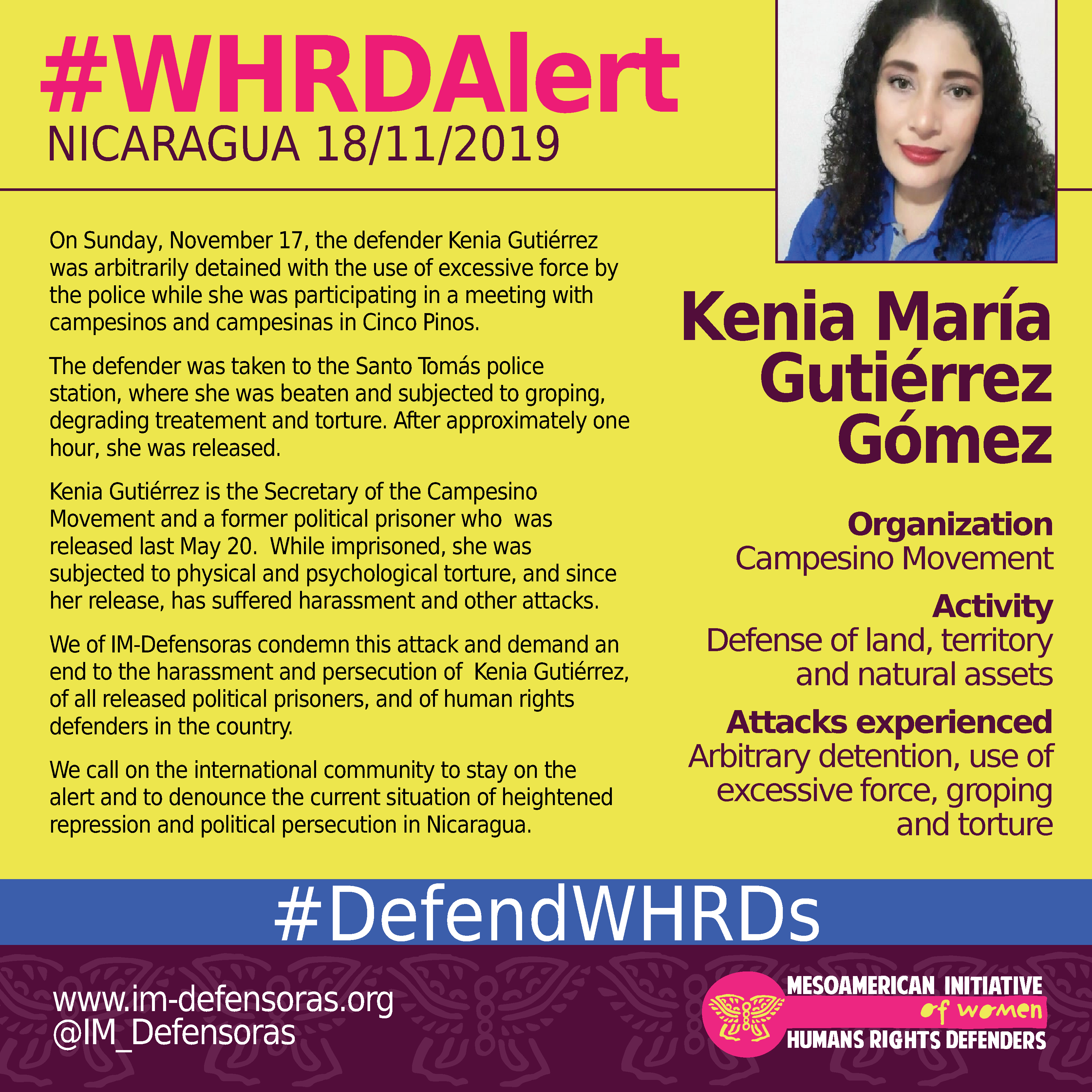 We of IM-Defensoras condemn this attack and demand an end to the harassment and persecution of Kenia Gutiérrez, of all released political prisoners, and of human rights defenders in the country.