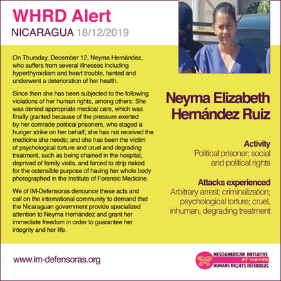We of IM-Defensoras denounce these acts and call on the international community to demand that the Nicaraguan government provide specialized attention to Neyma Hernández and grant her immediate freedom in order to guarantee her integrity and her life.