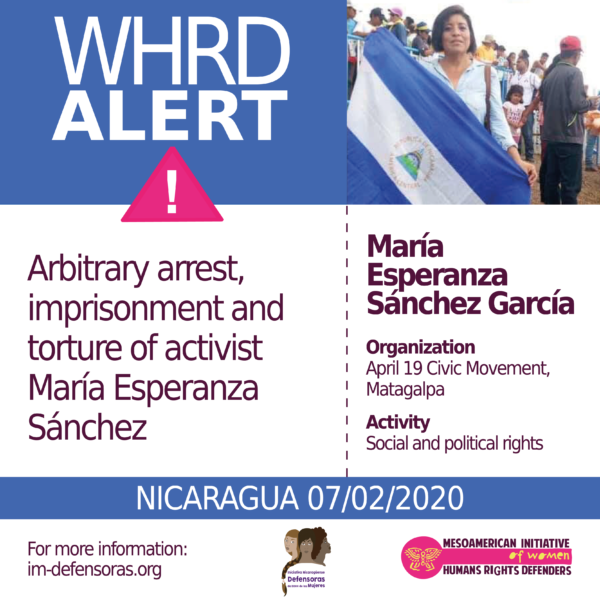 THE FACTS – On the night of January 26, the activist María Esperanza Sánchez was arbitrarily arrested by the police. The arrest took place in a security house in which the defender had sought asylum due to the constant siege she was under in her own home in Matagalpa. On Thursday, February 6, María Esperanza was transferred to the women’s prison known as “La Esperanza” (Hope), where she is still confined.