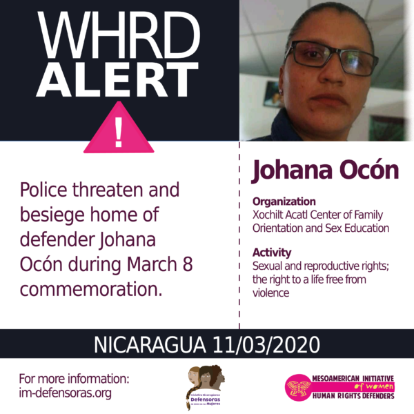 THE FACTS – Between March 7 and 10, defender Johana Ocón, of the Xochilt Acatl Women’s Association in Malpaisillo, was the target of besiegement and threats made by police agents, including the Chief of Police of the city of León, who threatened her directly.