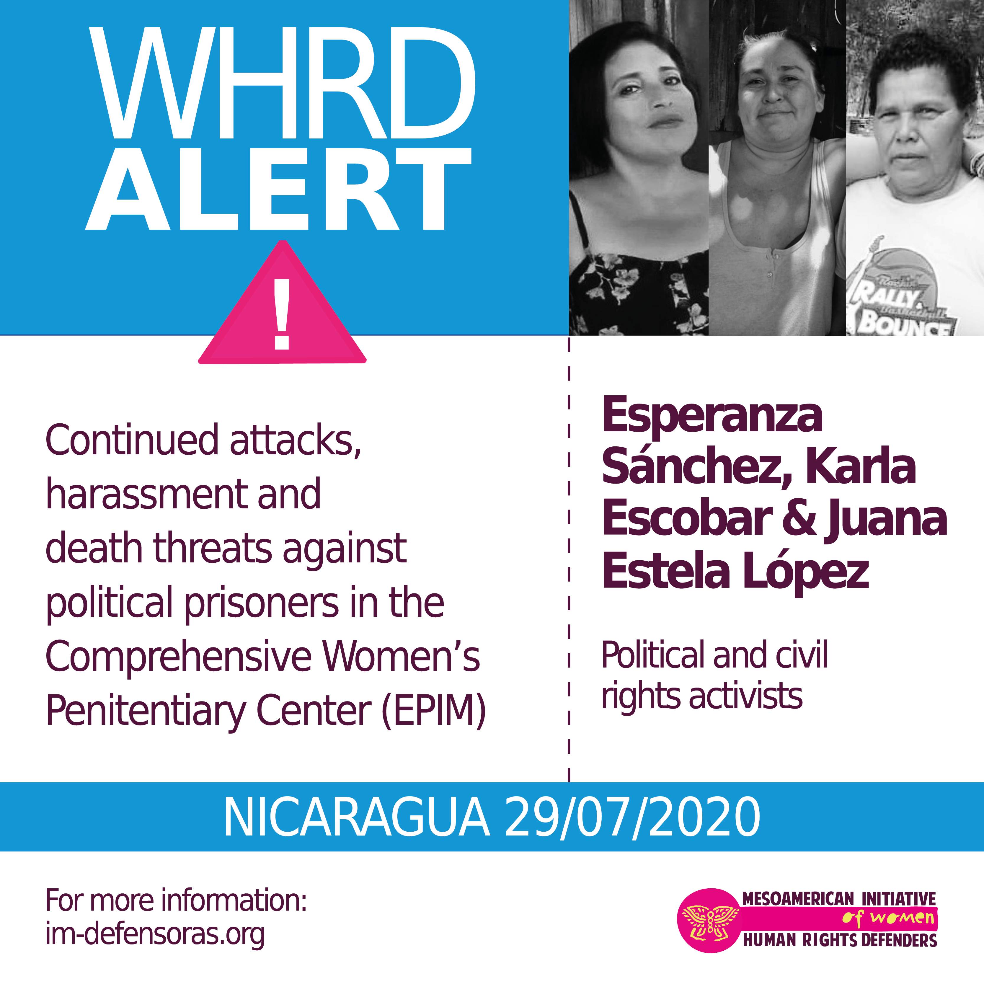 We of IM-Defensoras repudiate the climate of aggression and threats faced by political prisoners Esperanza Sánchez, Juana Estela López and Karla Escobar, and hold the Nicaraguan government responsible for their lives and their physical, moral and psychological integrity.