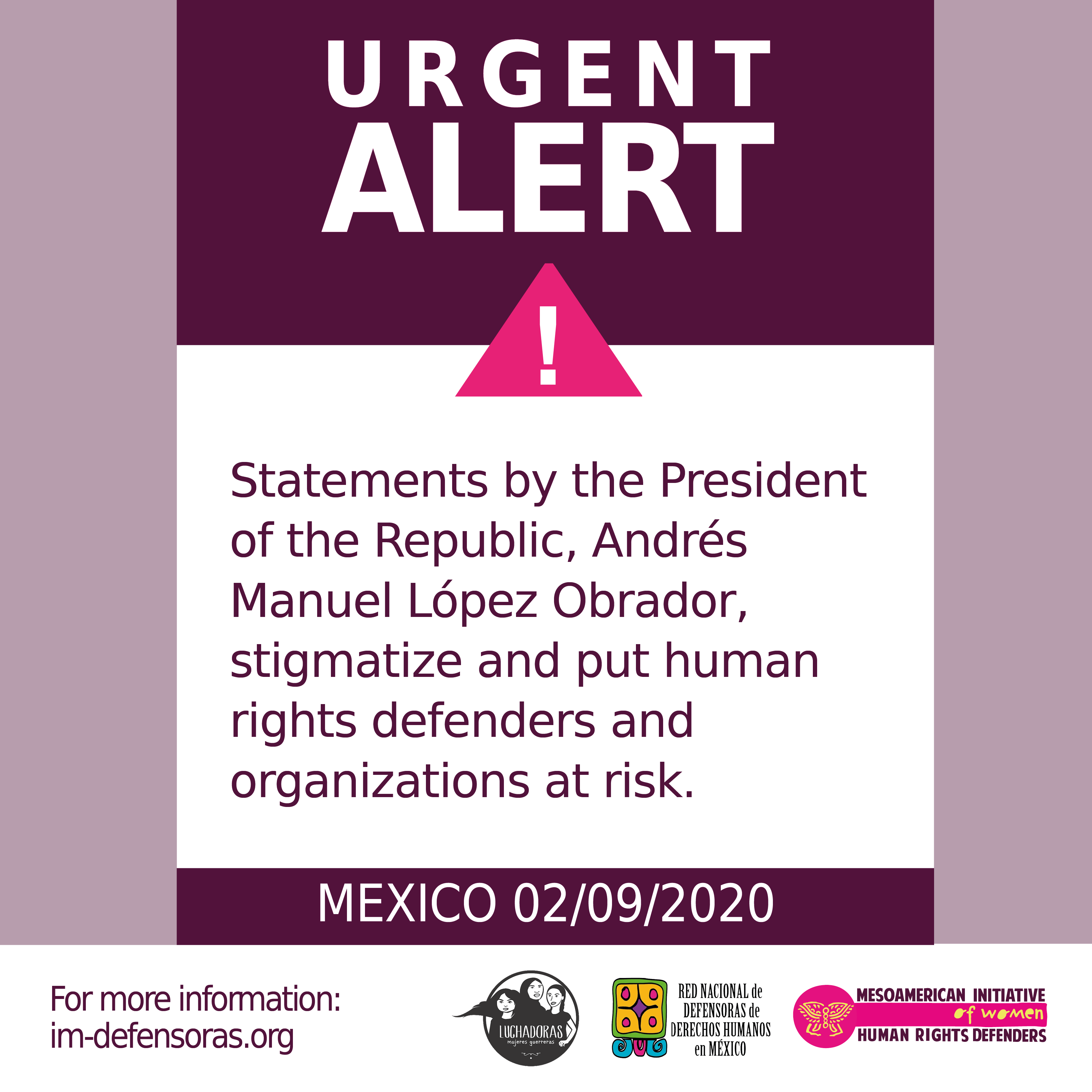 From IM-Defensoras, the National Network of Women Human Rights Defenders in Mexico, and Luchadoras, we demand a rectification by President López Obrador, and that it be accompanied by public recognition of the fundamental work carried out by human rights defenders and organizations that have historically fought for democracy and opened paths to justice, which are indispensable in all processes of social transformation.