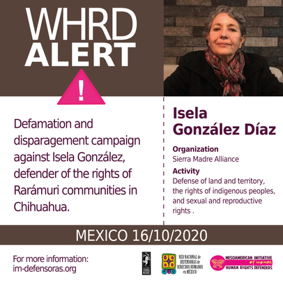 We of IM-Defensoras, the National Network of Women Human Rights Defenders in Mexico, and the Sierra Madre Alliance demand an end to the smear campaign against the human rights defender Isela González, as well as guarantees for her security and that of all people who make up the Rarámuri community of Choréachi.