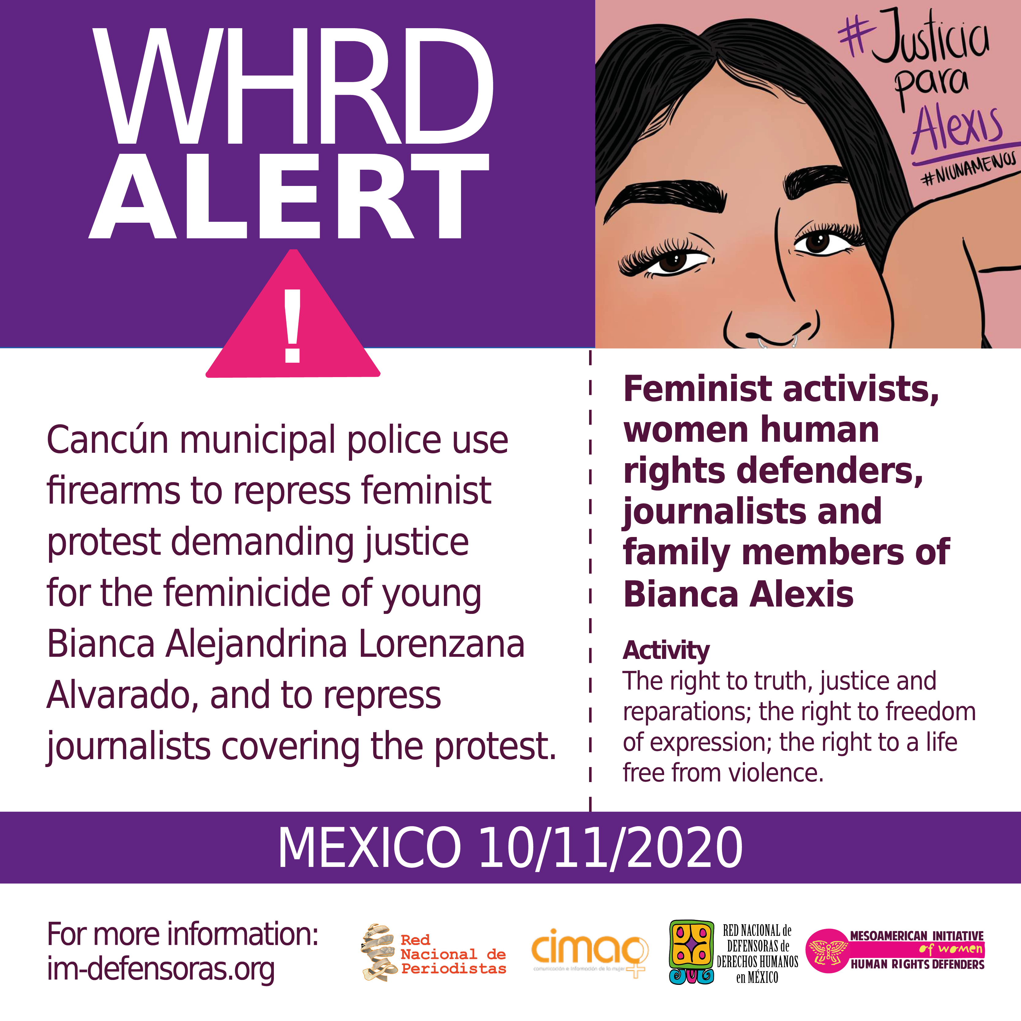 THE FACTS – On Monday afternoon, November 9th, local Cancún police of the Benito Juárez municipality fired on women journalists, women human rights defenders, feminist activists, family members of Bianca Alejandrina Lorenzana Alvarado and demonstrators who had gathered outside City Hall to demand justice for the feminicide of Bianca.