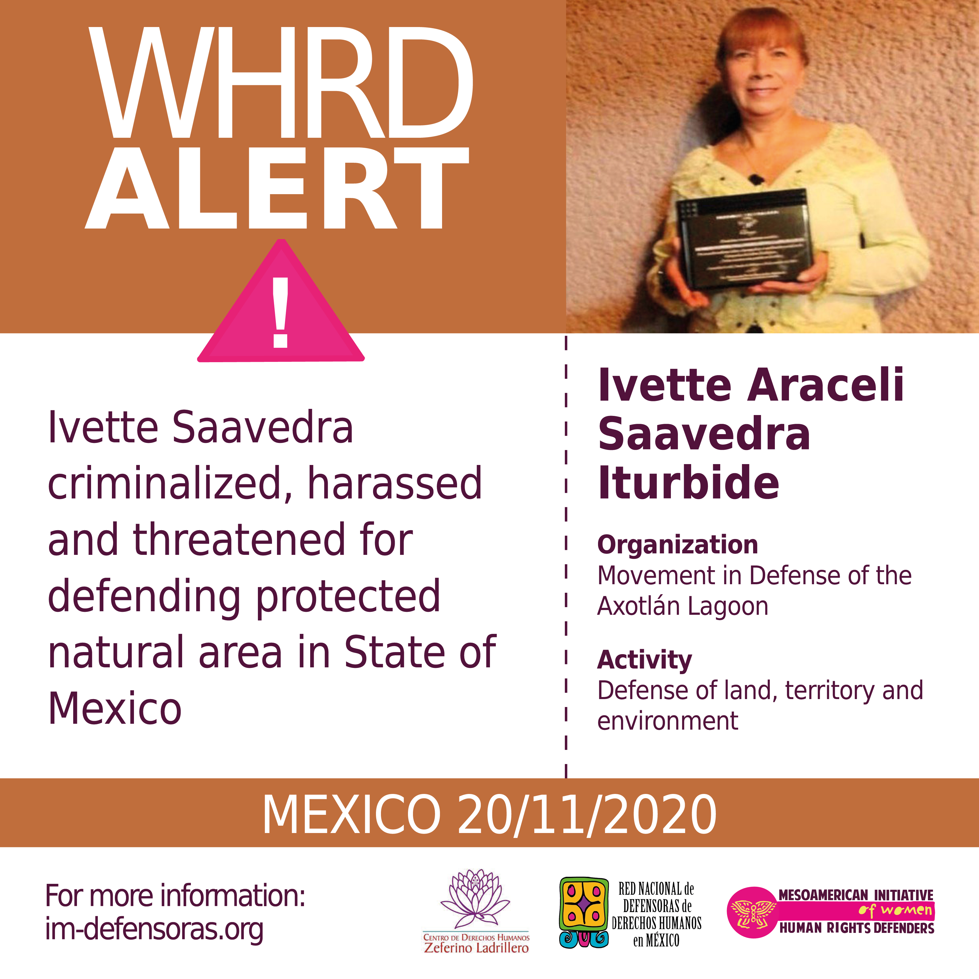 We of IM-Defensoras, the National Network of Women Human Rights Defenders in Mexico, and the Zeferino Ladrillero Center for Human Rights demand an immediate end to the criminalization of Ivette Saavedra and all the members of the Movement in Defense of the Axotlán Lagoon, and we further demand respect for the right to defend the land and territory with absolute freedom and security guarantees.
