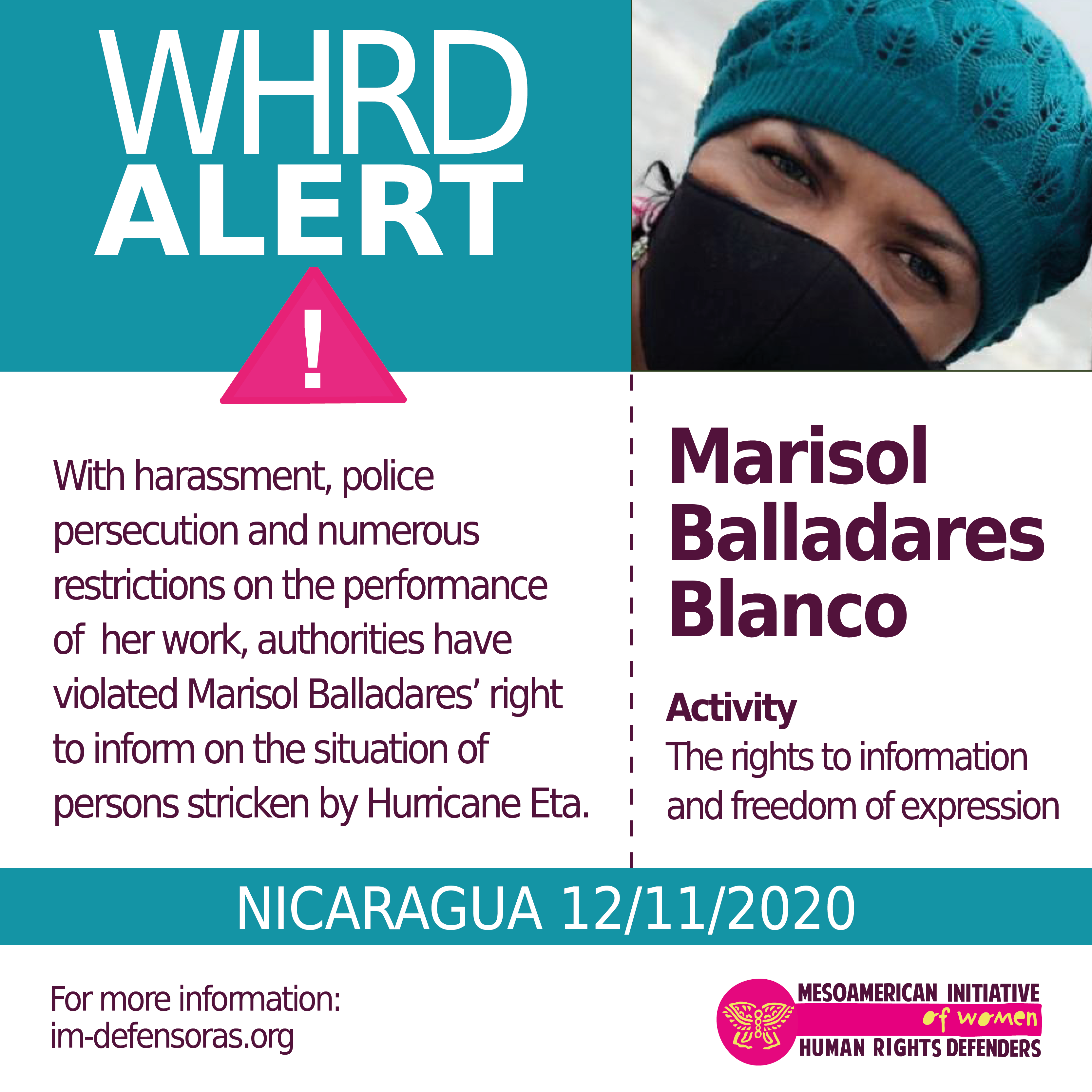 THE FACTS - Last November 8th, the journalist and lawyer Marisol Balladares Blanco, accompanied by her cameraman Fernando Duvan Rivera, left Managua for the Caribbean Coast with the intention of giving journalistic coverage and fostering humanitarian aid to persons hard hit by Hurricane Eta. She has denounced the fact that since then, she is constantly subjected to harassment, rights violations, and persecution by the police and other government agents.
