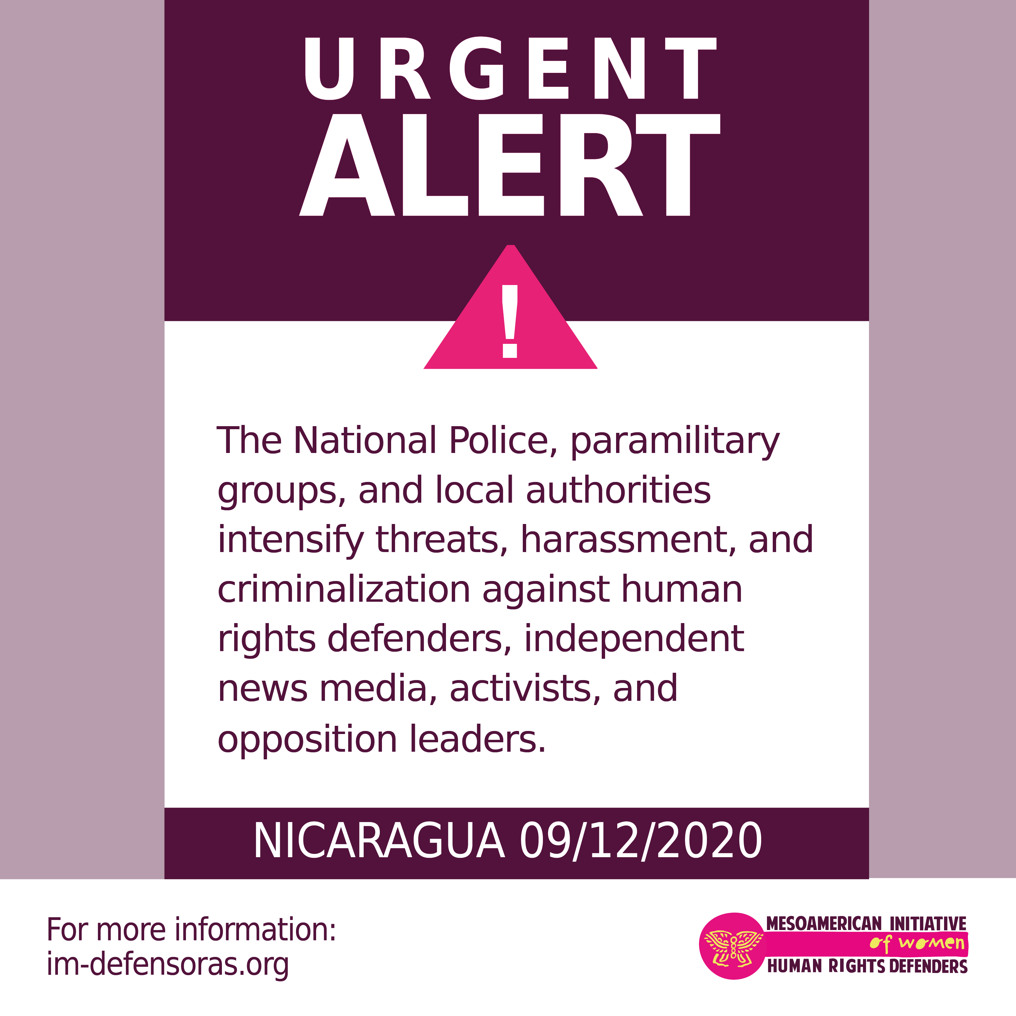 We of IM-Defensoras hereby denounce acts that place the personal integrity of women defenders, activists, and journalists at risk. We express our solidarity with the organizations, feminist groups and news media persecuted by the Daniel Ortega government.