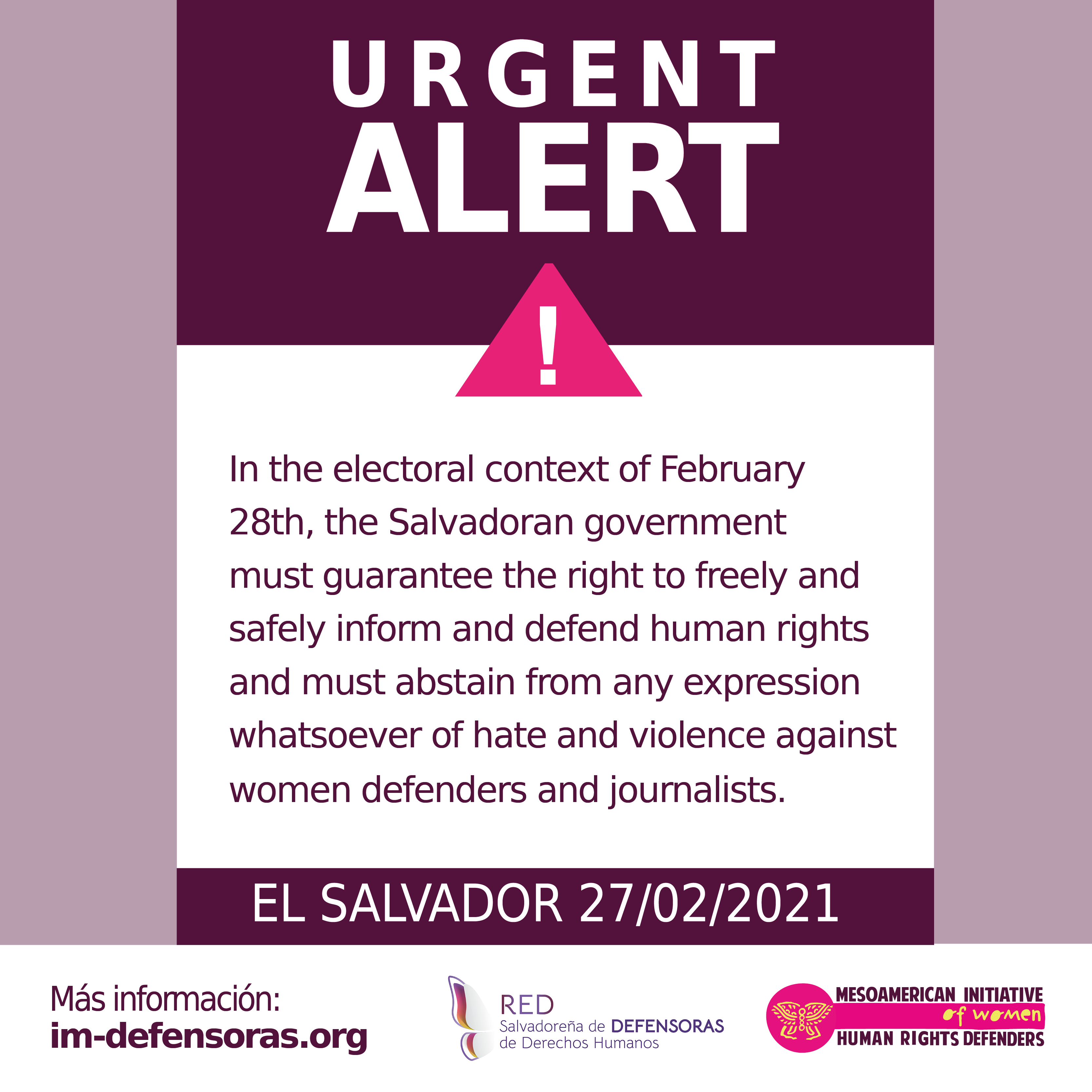 We of the Salvadoran Network of Women Human Rights Defenders and IM-Defensoras, given the situation we have described, are concerned about the elections slated for this Sunday, February 28th being held with full guarantees of political participation, freedom of expression, and the right to information and the right to defend rights under conditions of security for the women candidates of different parties, journalists, and women human rights defenders who will be involved in their work of monitoring and oversight of the process. For this reason, we demand that the Salvadoran government comply with its obligation to guarantee free, transparent, secure elections, and we hereby express our intention to be vigilant and willing to document and denounce any irregularity whatsoever as well as any infringement on the human rights of our Salvadoran women comrades.