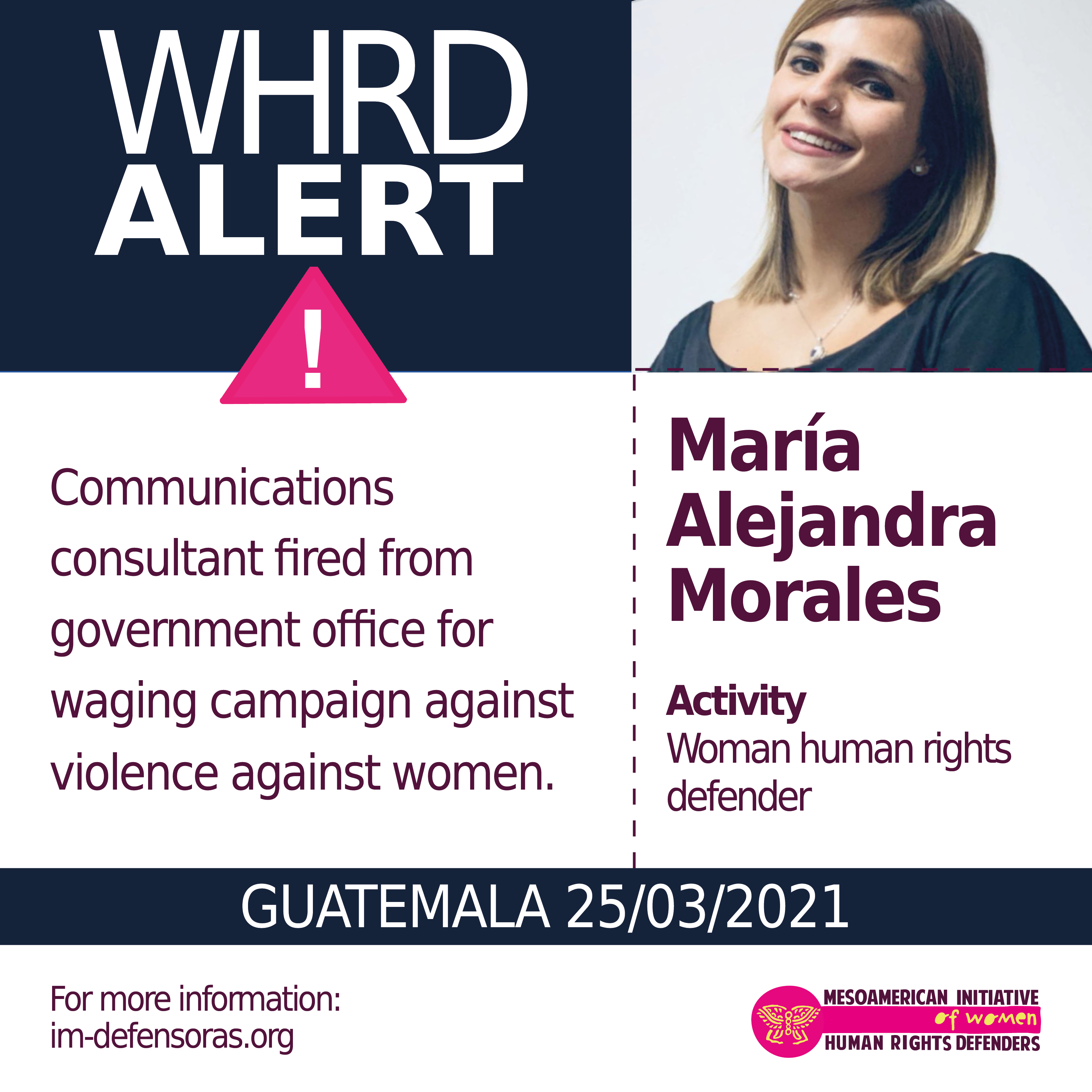 THE FACTS – Recently, the Guatemalan government has unilaterally and arbitrarily terminated the employment contract of defender María Alejandra Morales in the National Civil Service Office, where she worked as a communications consultant.