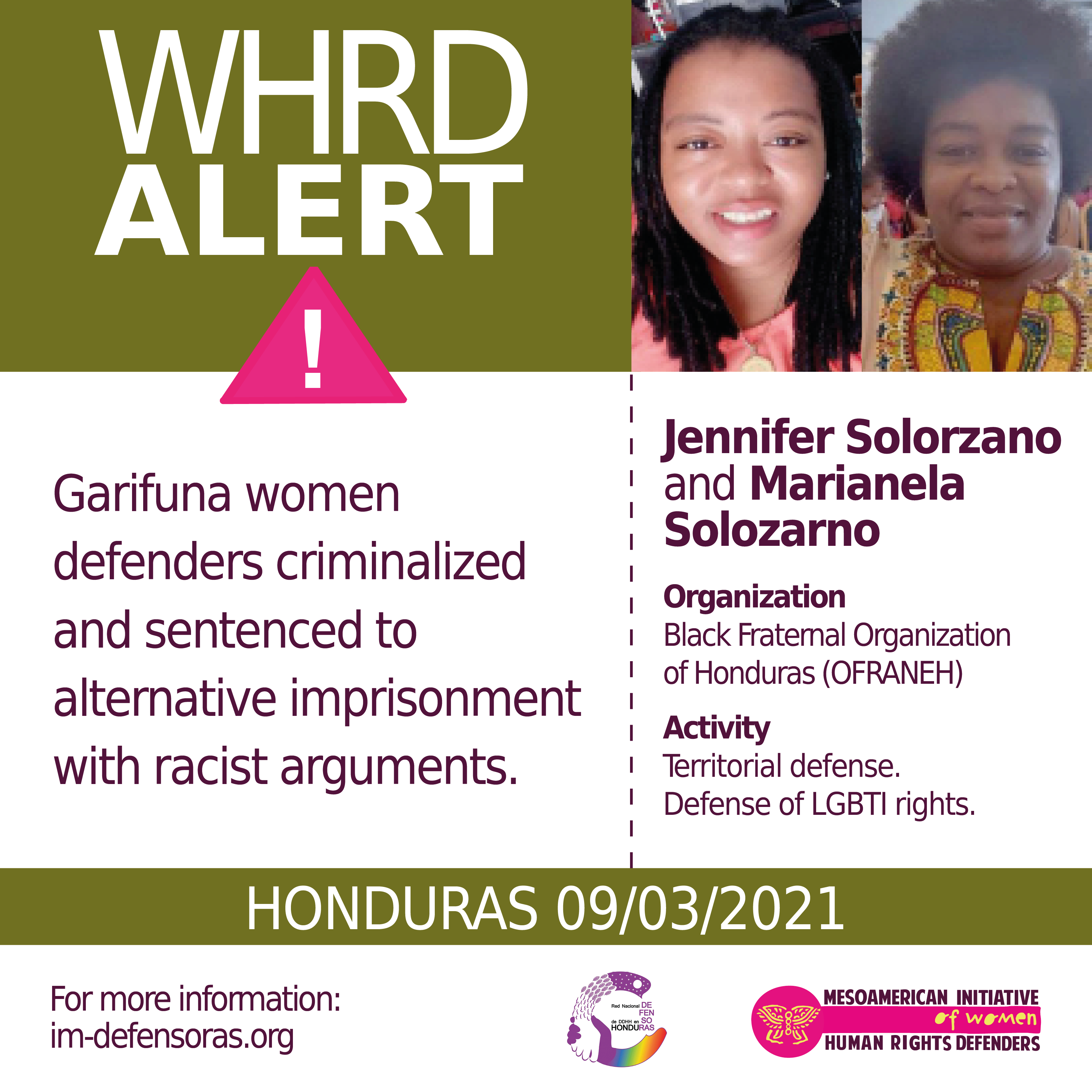 We of the National Network of Women Human Rights Defenders in Honduras and IM-Defensoras hereby denounce the fact that once again, the Honduran government is using criminal law to inhibit and obstruct the labor of the defense of human rights and to benefit the businesses exploiting ancestral territories. We repudiate the racist actions of the Honduran institutions of justice against women defenders and the Garifuna people.