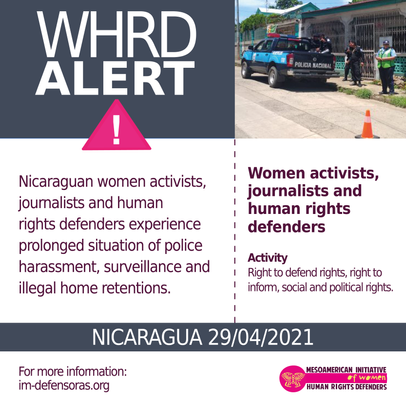 Since last April 18th, in the context of the commemoration of the anniversary of the social uprising of 2018, the police harassment of women activists, journalists and human rights defenders has intensified. Such harassment has taken place repeatedly and systematically along with restrictions on freedom of movement and acts of surveillance, persecution and illegal home retentions for as long as a week, all with the aim of preventing women defenders from mobilizing to pursue their legitimate right to protest.
