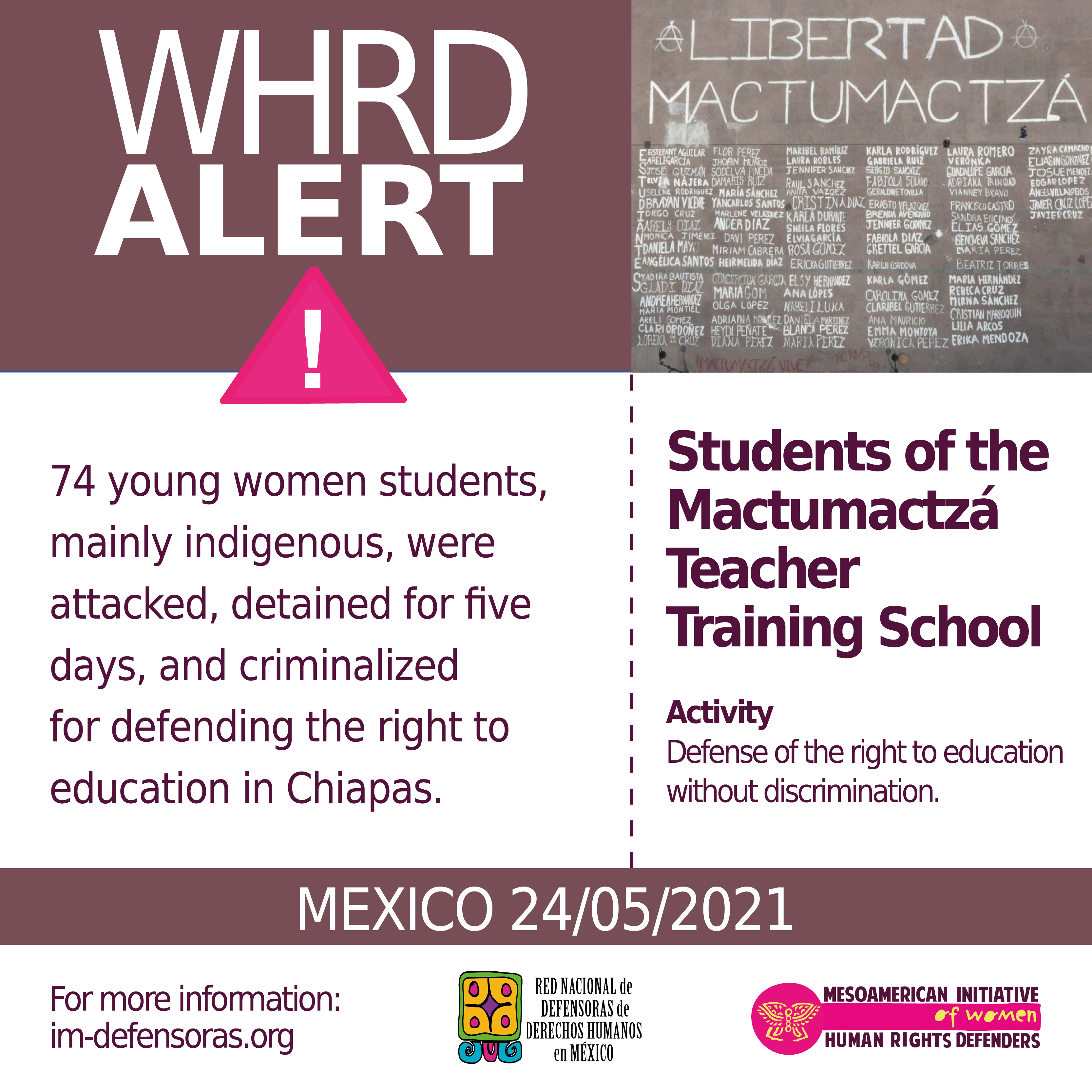We of IM-Defensoras and the National Network of Women Human Rights Defenders recognize the dignity, legitimacy, and importance of the struggle of the student comrades of the Mactumactzá Rural Teacher Training School. By asserting their right to access to education, they are defending the right of the most violently abused, excluded and discriminated people to resist policies of death and to continue to build their own forms of resistance and life alternatives.