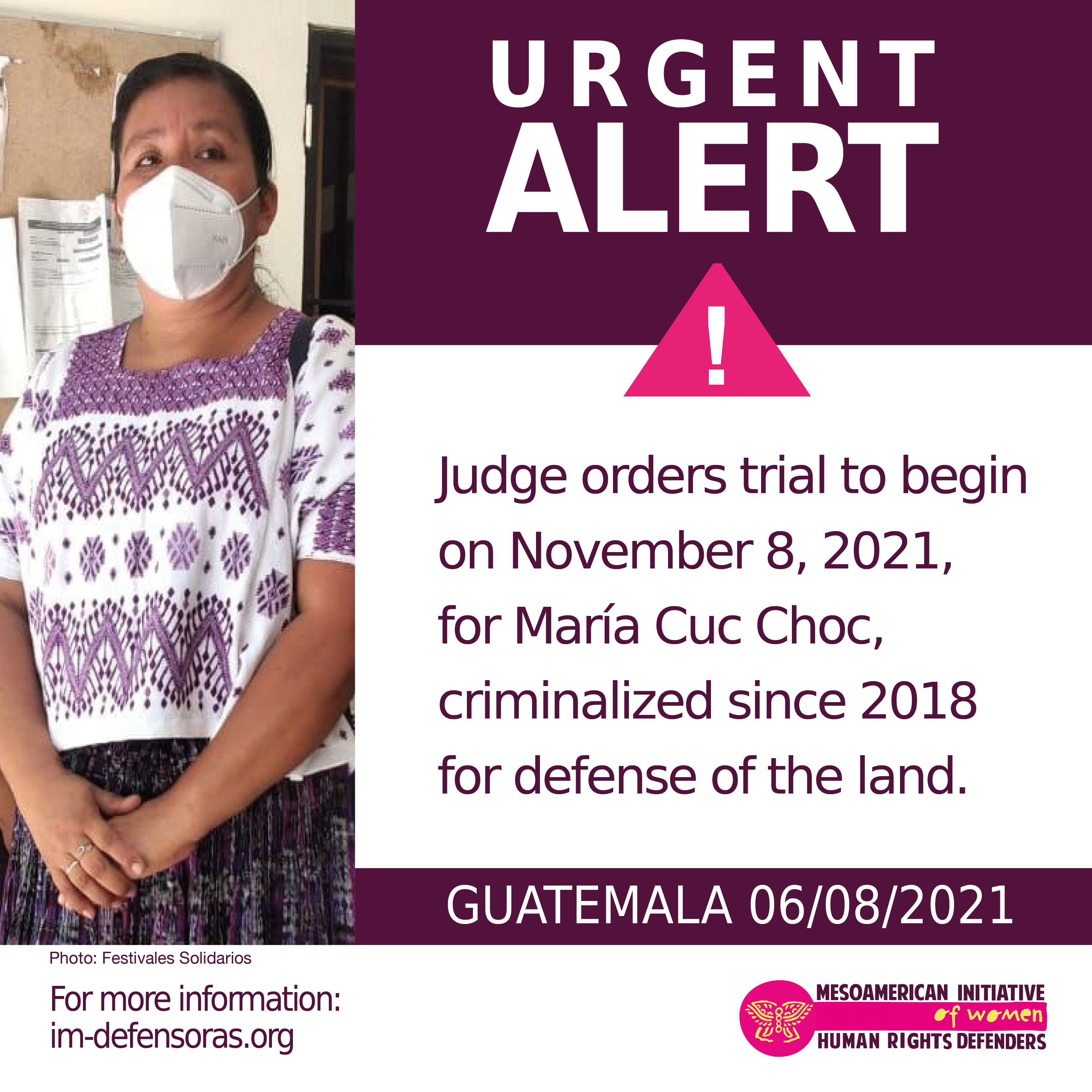 We demand an immediate end to the criminalization of María Cuc Choc and call on the international community to join us in making this demand, shoulder responsibility, and express solidarity with the defender.