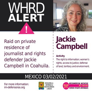 [WHRD Alert] MEXICO / Raid on private residence of journalist and rights defender Jackie Campbell in Coahuila.
