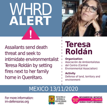 [WHRDAlert] MEXICO / Assailants send death threat and seek to intimidate environmentalist Teresa Roldán by setting fires next to her family home in Querétaro