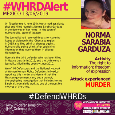 #WHRDAlert MEXICO / Journalist Norma Sarabia Garduza killed in Tabasco