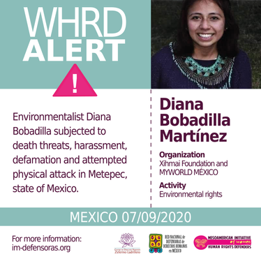 [WHRD Alert] MEXICO / Environmentalist Diana Bobadilla subjected to death threats, harassment, defamation and attempted physical attack in Metepec, state of Mexico